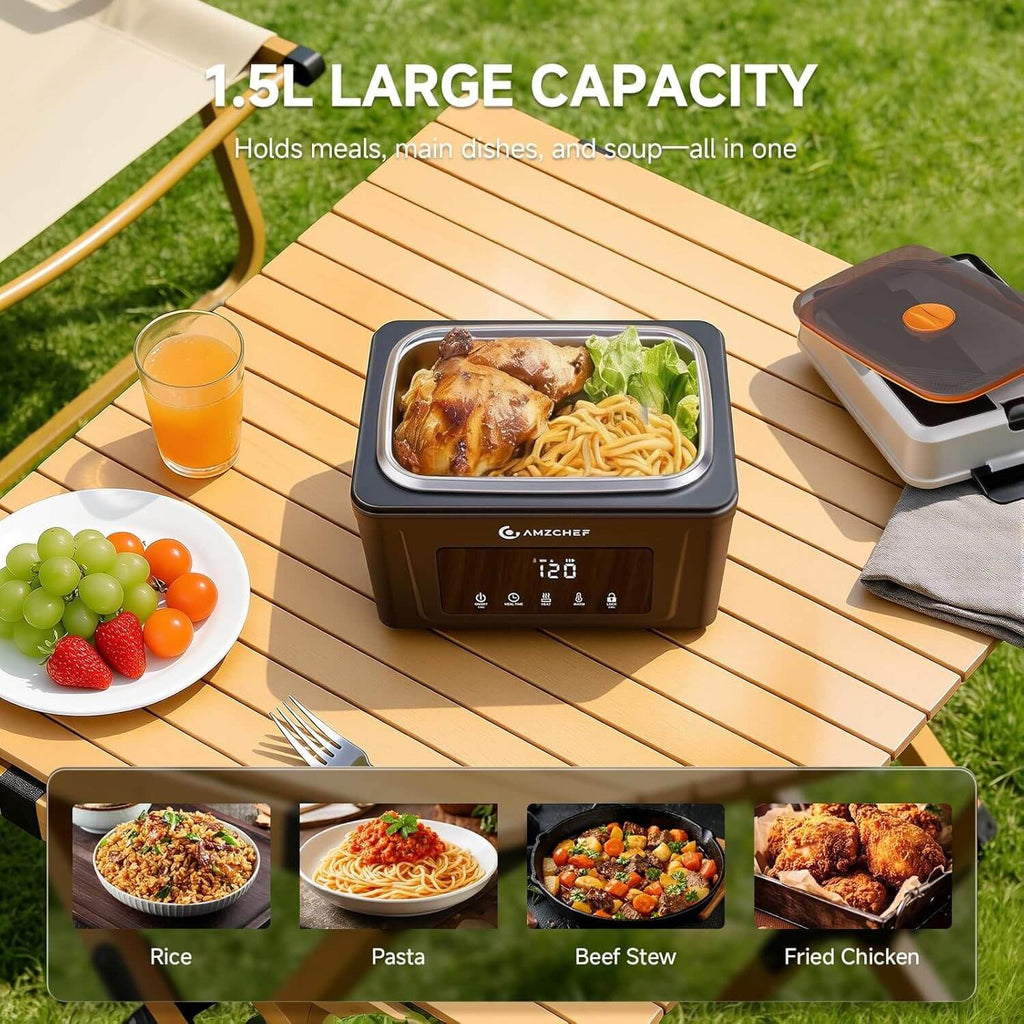 [1.5L HEATED LUNCH BOX FOR ADULT]The 1.5L lunch box offers an ample capacity of 6.3 cups, which is 25% larger than the standard 1.2L (5.1 cups) lunch boxes you typically find. This extra space allows you to easily fit all your meals inside. Additionally, it features a convenient built-in divider for vegetables, helping you keep different foods separated just the way you prefer.